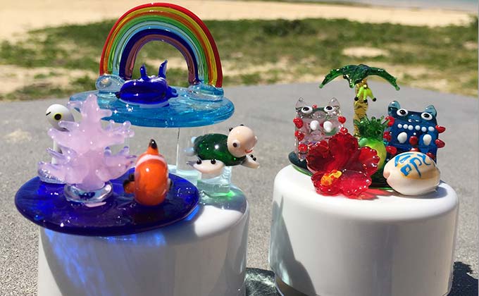 オルゴールの横面に自由にペイントしていただき、上面を飾るガラス細工をいろいろとご用意。貝殻パーツは無料。