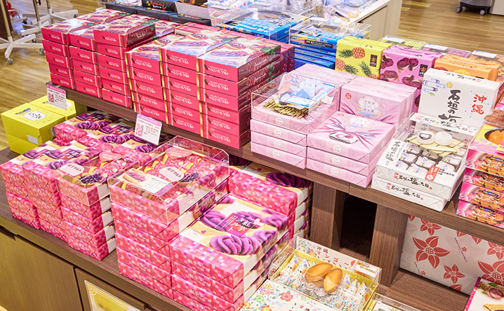 - 紅芋やシークヮーサーなど新鮮な県産素材を活かした沖縄定番銘菓や琉球王国時代から伝わる昔ながらの伝統菓子「くんぺん」などもご用意しております。